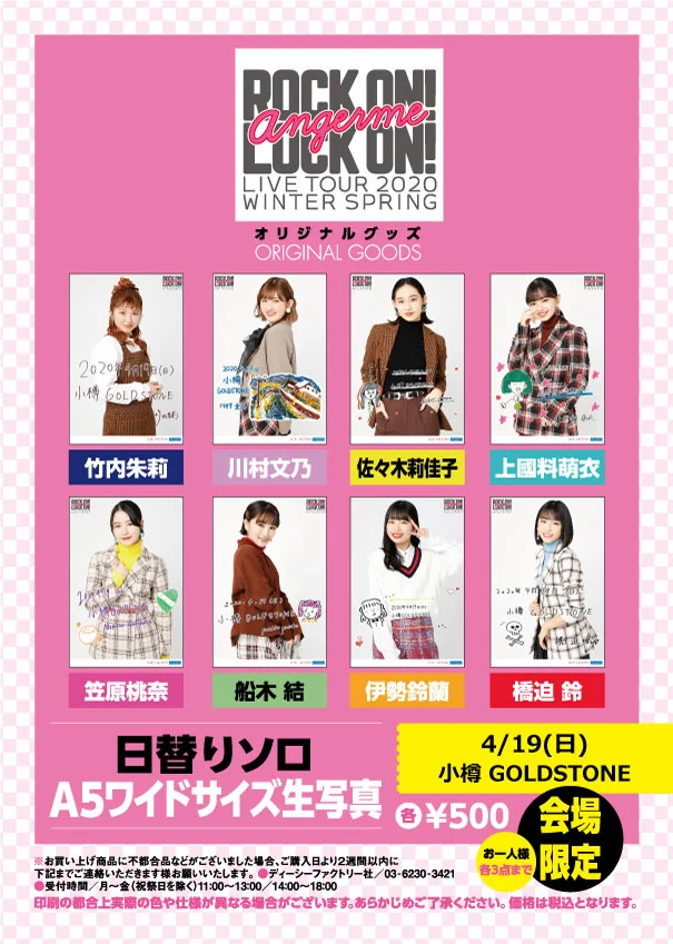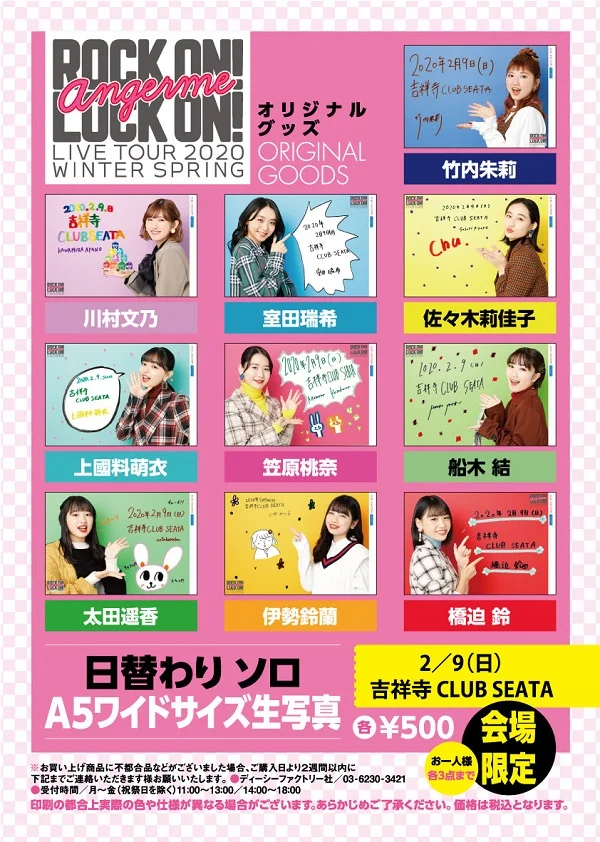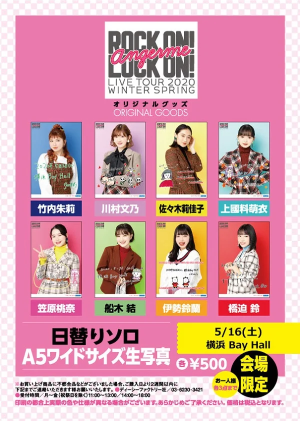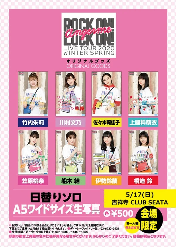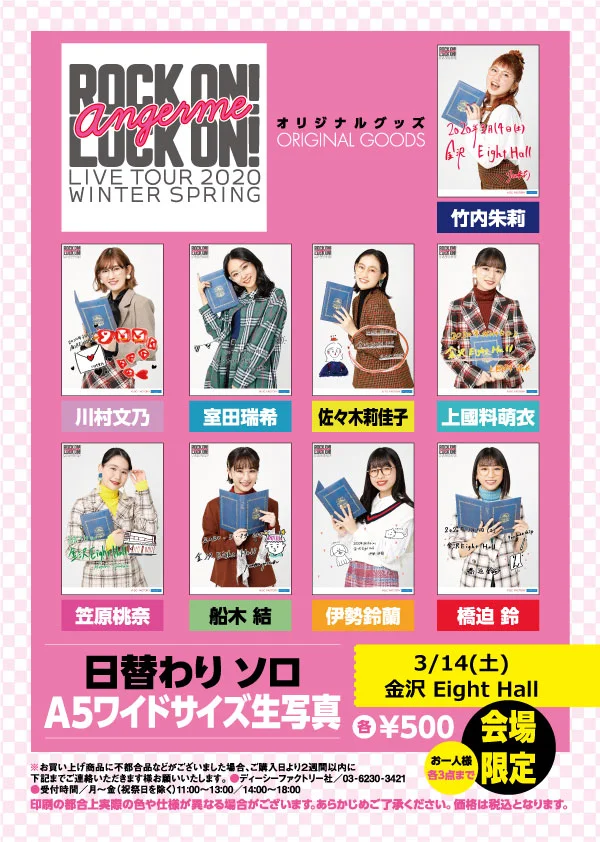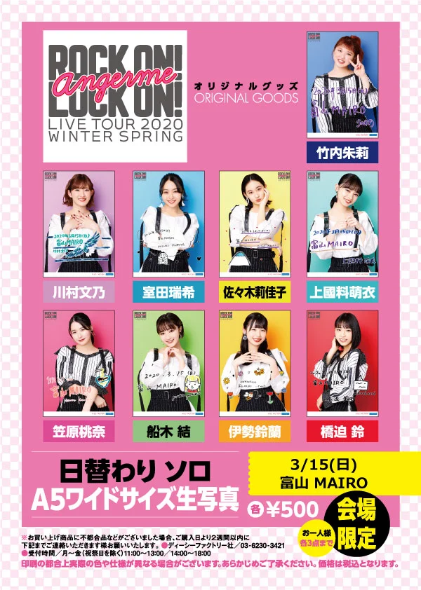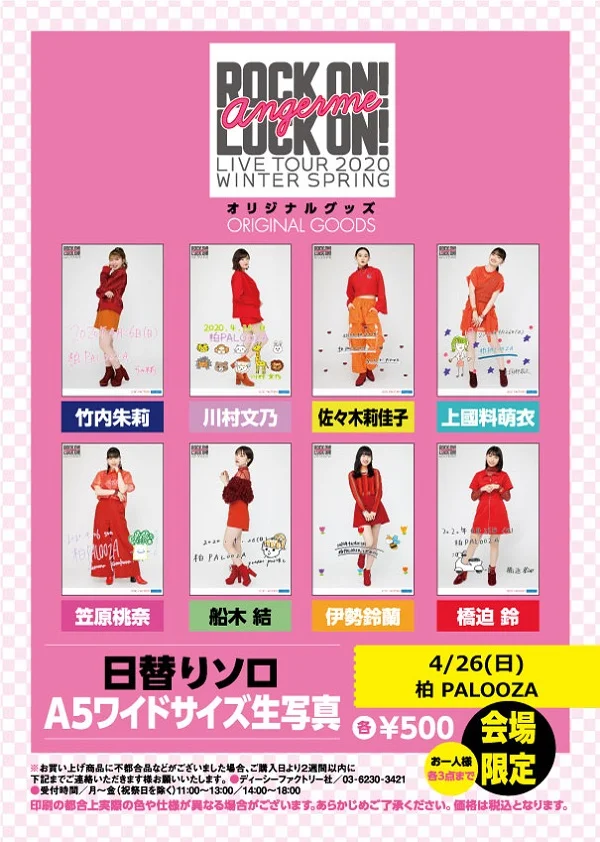 2/29柏PALOOZA、3/1新宿ReNY、3/7横浜BayHall、3/8NEXS NIIGATA、3/14金沢EightHall、3/15富山MAIRO公演で販売を予定していた日替り生写真を期間限定で受注販売いたします。