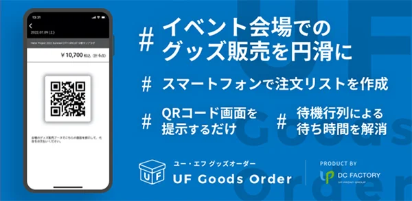 株式会社アップフロントグループ ディーシーファクトリー社が実施するコンサート・イベント会場でのグッズ販売を円滑に行うため、事前に購入希望商品をスマートフォンでオーダー入力していただき、売場ではQRコード画面をご提示いただくだけで簡単に注文ができるオーダーアプリとなります。