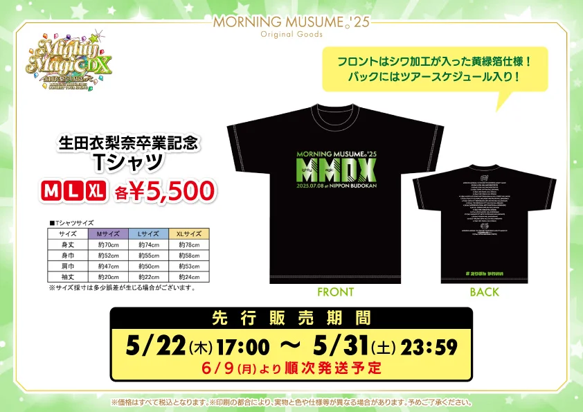 7月8日(火)モーニング娘。'25 コンサートツアー春 Mighty Magic DX~生田衣梨奈を見送って~公演に先駆けて、5月22日(木)17:00より、Tシャツ、シリコンバンドをe-LineUP!Mallで先行販売いたします!