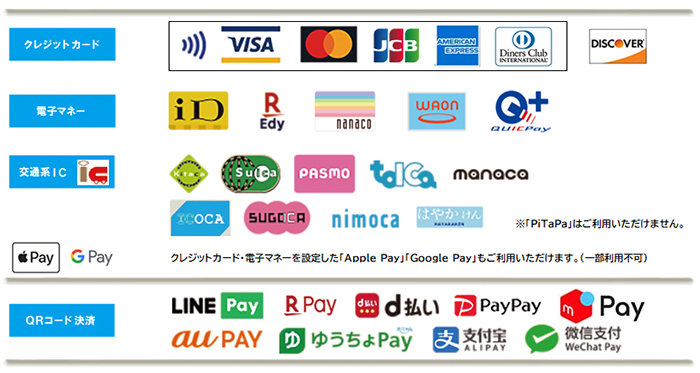 「クレジットカード」「電子マネー」「交通系IC」「QRコード決済」等、各種決済方法をご利用いただけますので、ご協力をお願いいたします。