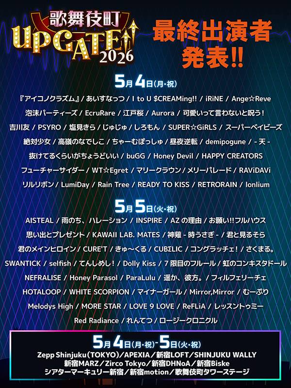 【会場】Zepp Shinjuku(TOKYO) / APEXIA / 新宿LOFT / SHINJUKU WALLY / 新宿MARZ / Zirco Tokyo / 新宿DHNoA / 新宿Biske / シアターマーキュリー新宿 / 新宿motion / 歌舞伎町タワーステージ
